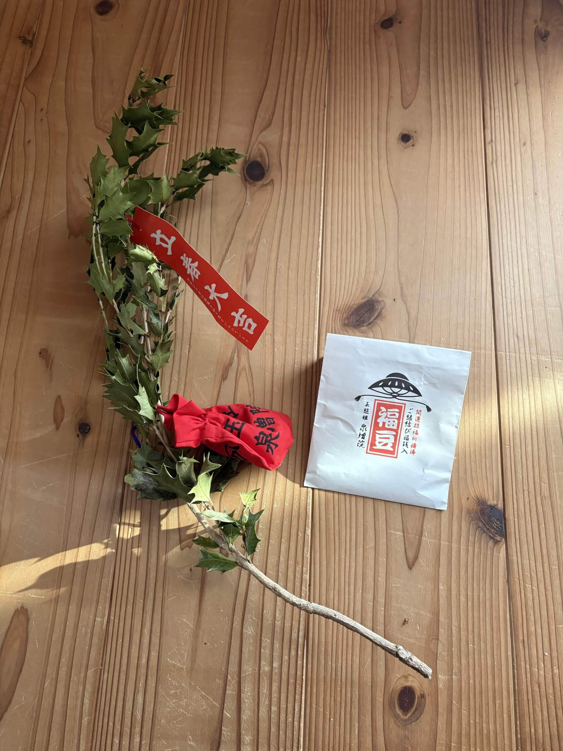 魔除けの柊と福豆(福銭入り)です。
